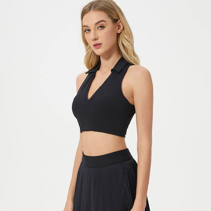 Stylish women’s sports vest bra with polo collar and hollow back design, offering high support, breathable comfort, and stretchable fit—perfect for yoga, gym, tennis, and running.