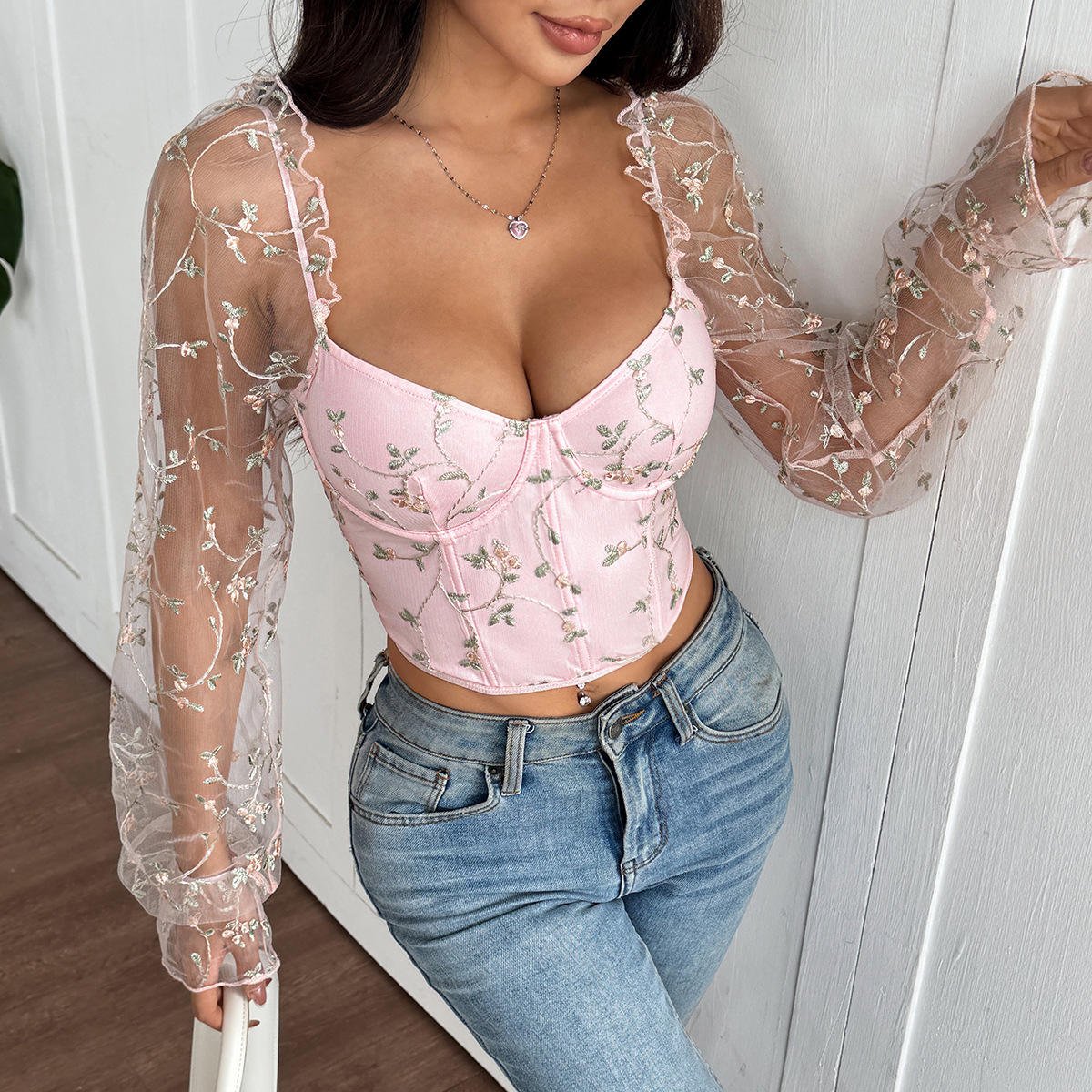 Sheer Mesh Corset Top for Women | Long Sleeve Embroidered Bustier