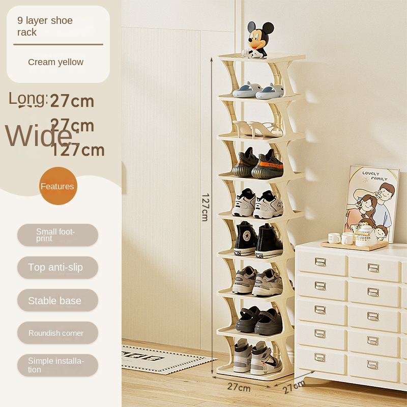 Modern 9-layer standing shoe rack made from durable plastic with size 27×27×127 cm. Space-saving design holds up to 11 pairs of shoes, ideal for organized and clutter-free storage.