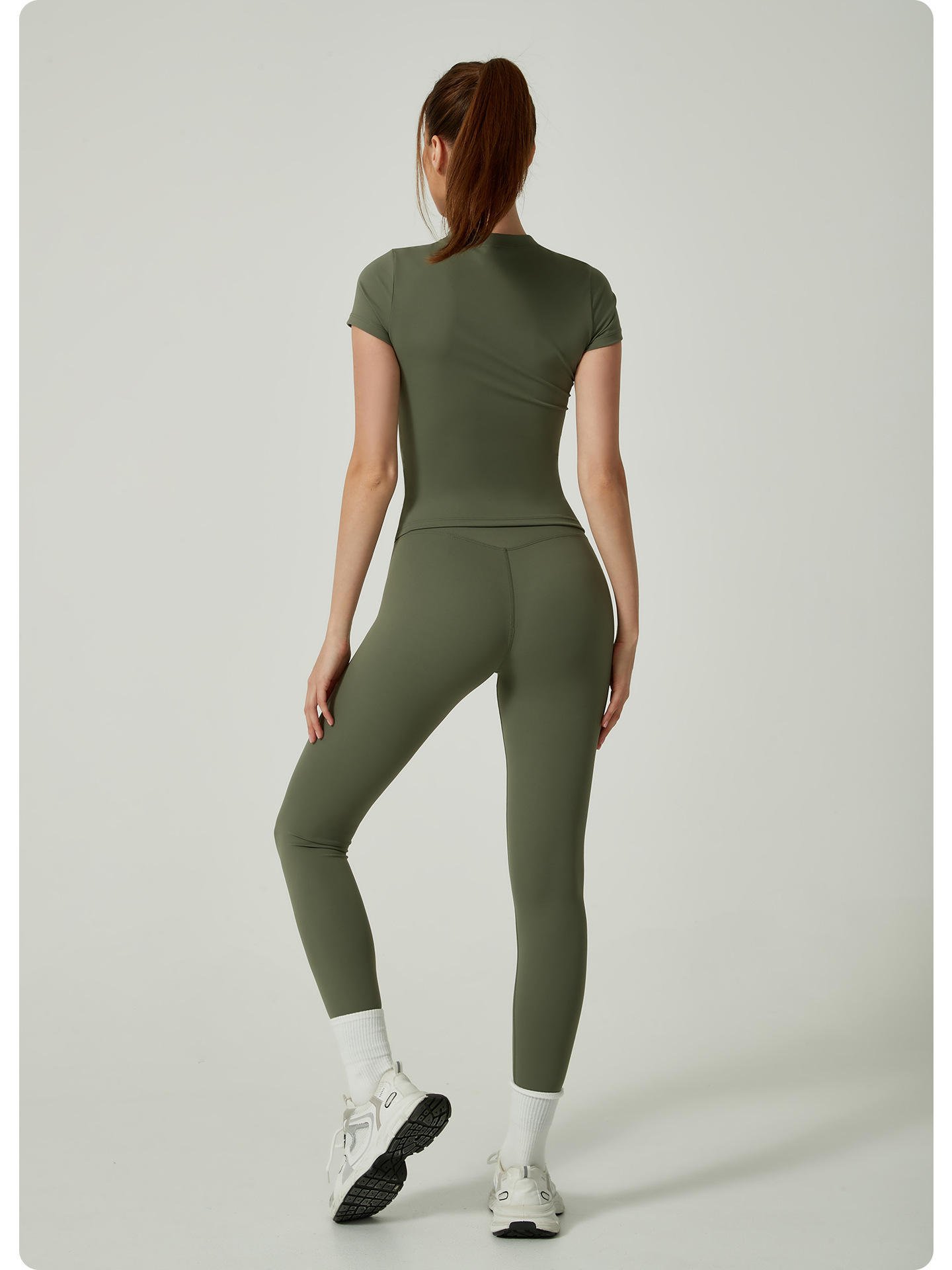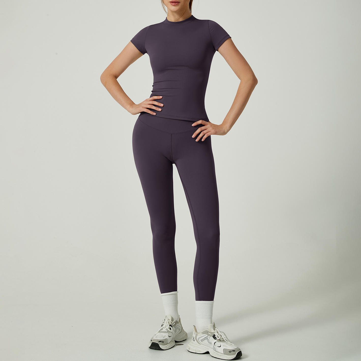 High-quality women’s yoga set with short sleeve T-shirt and high waist leggings. Made from nylon-spandex fabric, breathable, lightweight, quick-dry, perfect for workouts, yoga, and activewear comfort.